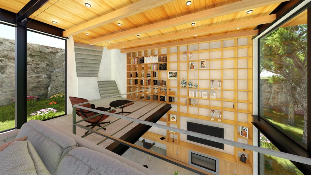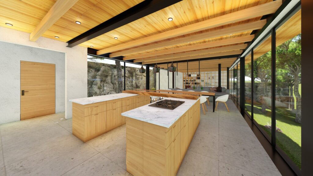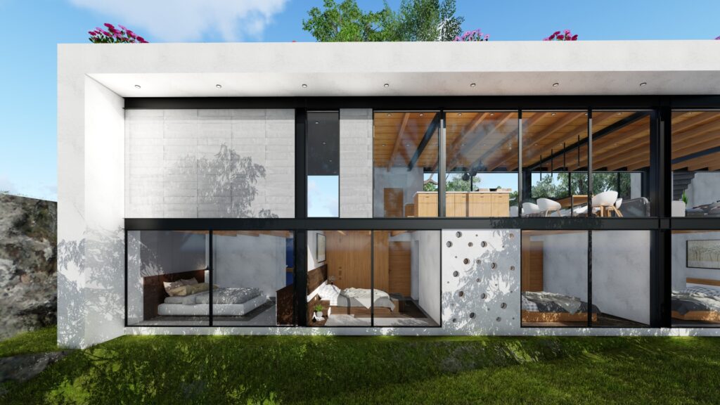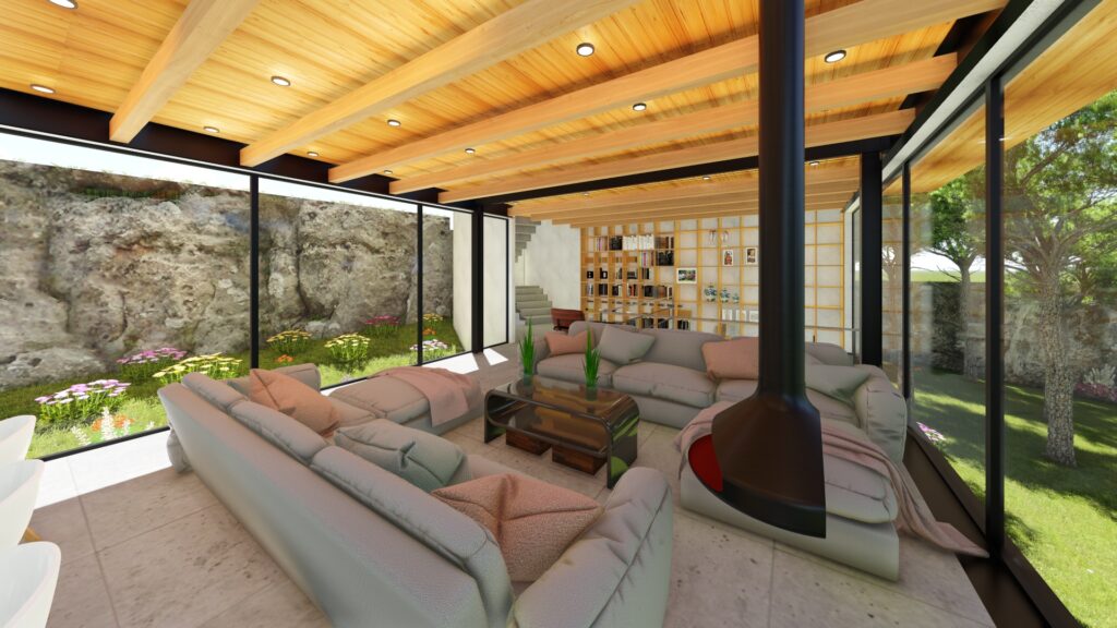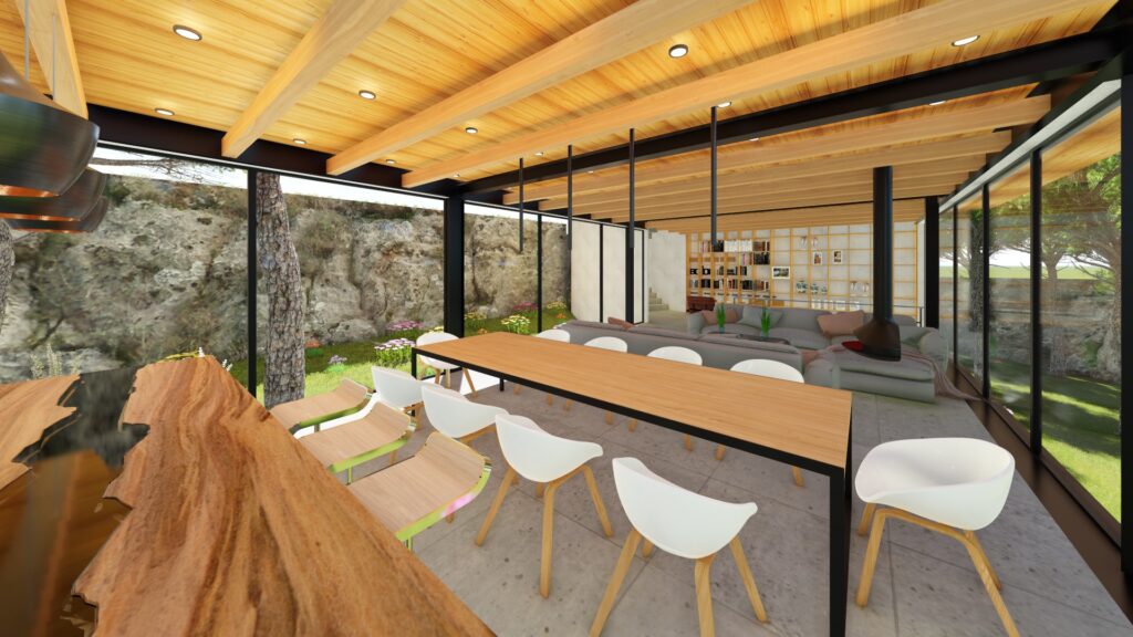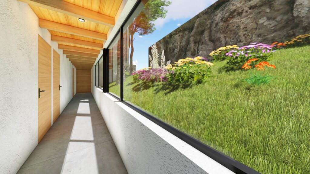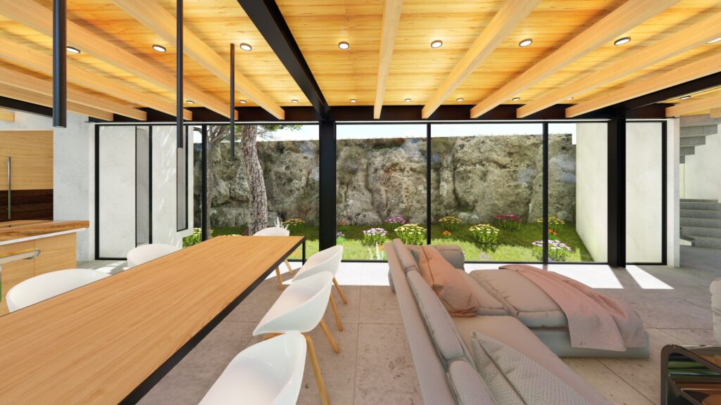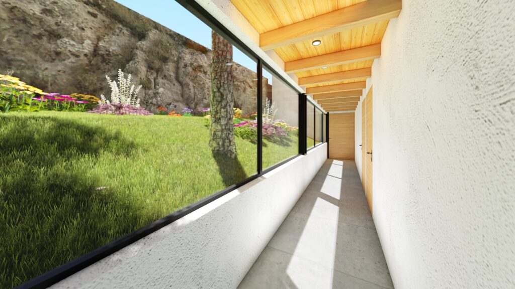 El terreno con desnivel pronunciado se convirtió en el punto de partida para la creatividad. La casa, diseñada en forma de “U”, abraza y respeta la topografía única del lugar. Inspirada en las viviendas tradicionales de la región, la distribución en forma de “U” permite la creación de un patio central, el corazón de la casa, que actúa como un núcleo central alrededor del cual se desarrollan todos los espacios.