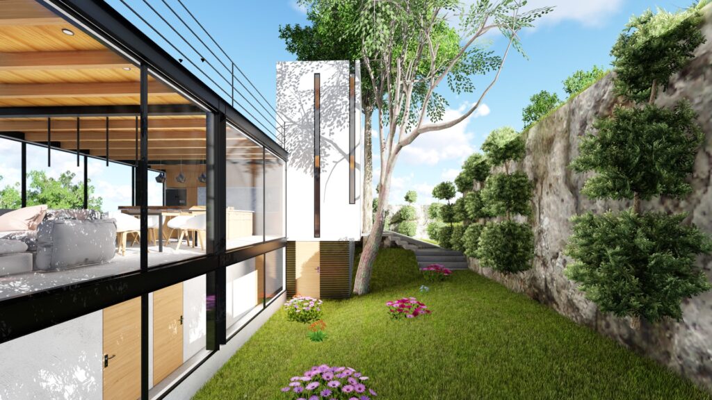 Con un terreno amplio a su disposición, “Casa Utopía” se deleita en la abundancia de áreas verdes. Jardines meticulosamente planificados y patios al aire libre ofrecen lugares tranquilos para la contemplación y el juego. El diseño incorpora la vegetación de manera armoniosa, proporcionando un oasis verde en medio del bullicio urbano.