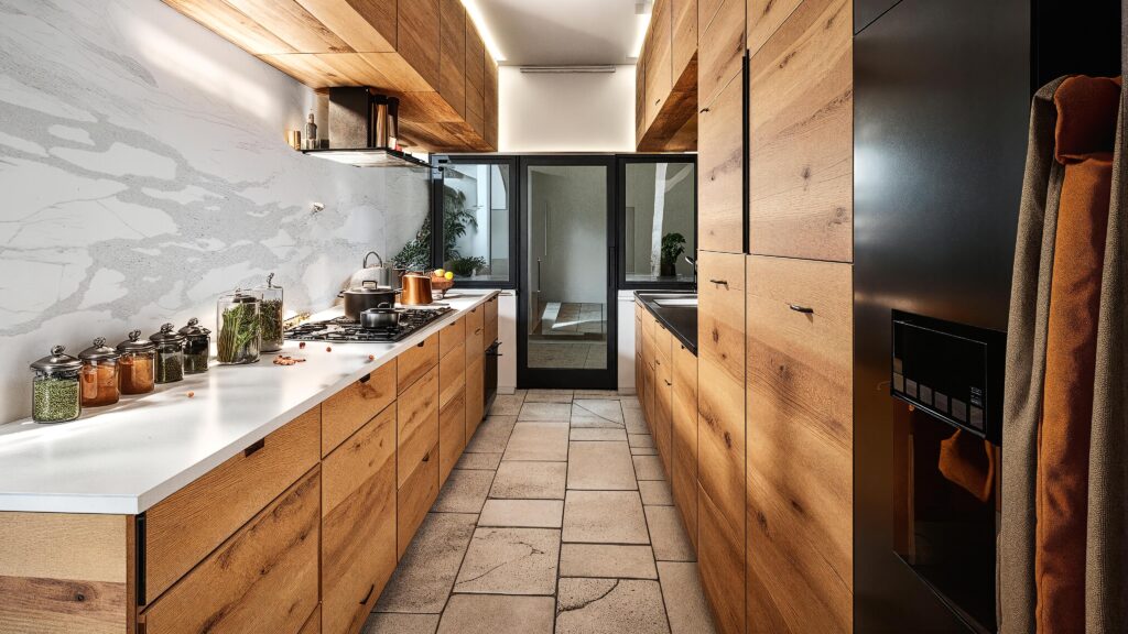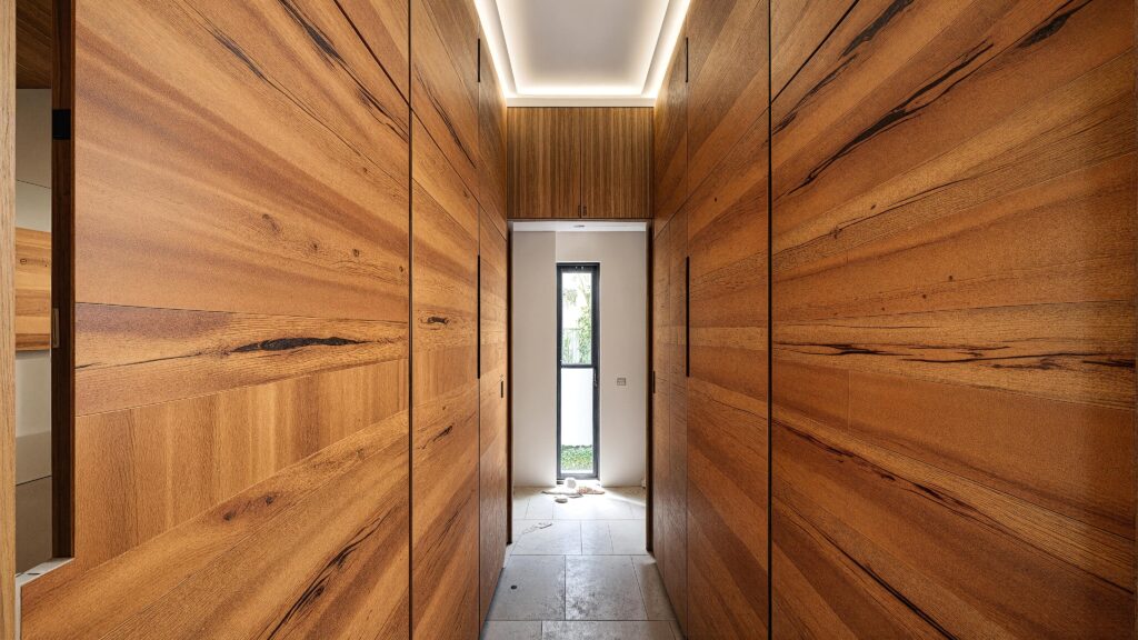 Desde el exterior, “Ciudad Real” mantiene una fachada discreta y en armonía con el paisaje urbano de San Cristóbal. Sin embargo, al cruzar el garaje y entrar en la propiedad, un espejo de agua con una fuente recibe a los visitantes y les adelanta la atención al detalle que caracteriza a este hogar. Al abrir la puerta principal, el verdadero protagonista arquitectónico se revela: una bóveda de ladrillo, de 60 cm adicionales de altura, ilumina todo el espacio central, destacada por una cálida luz LED en su perímetro, creando una atmósfera que sorprende y cautiva al instante.
