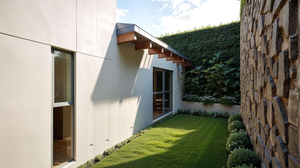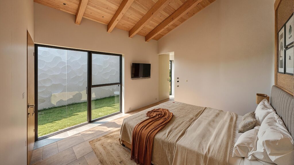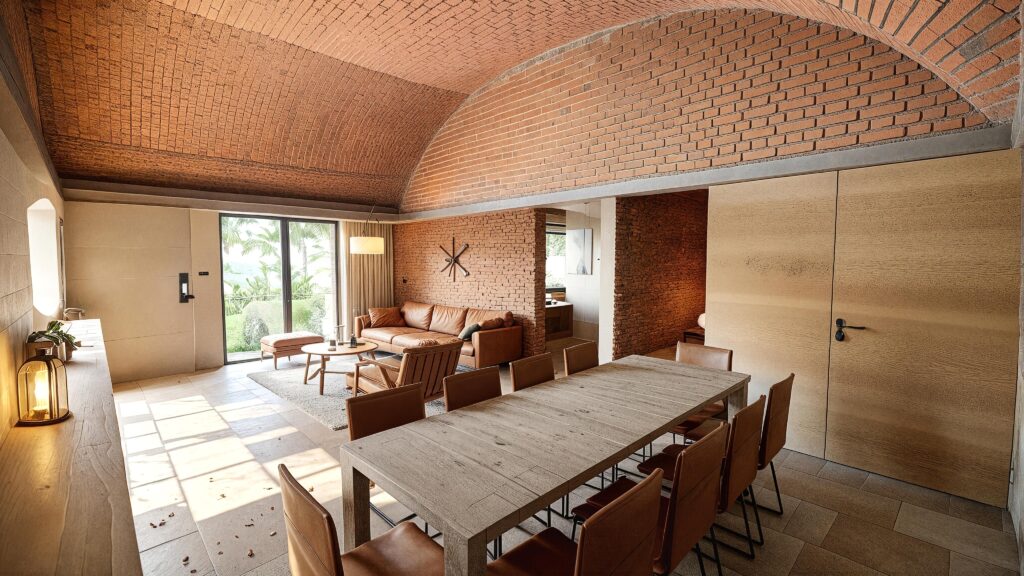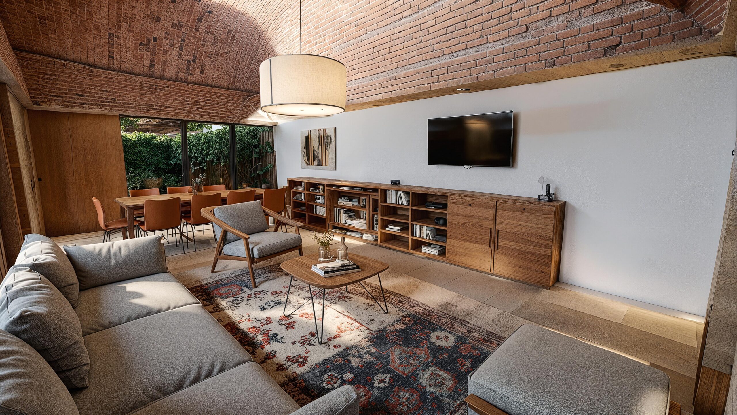 La propuesta de una bóveda de ladrillo no solo crea un efecto visual impactante, sino que también aporta una altura poco convencional, haciendo que el espacio se sienta expansivo y majestuoso. Para complementar, se emplearon losas mixtas de vigueta y bovedilla, junto con losas macizas, garantizando una estructura robusta y acogedora, perfecta para la vida en retiro y el disfrute de sus seres queridos. La casa se abre al fondo hacia un amplio jardín, que extiende la sensación de amplitud y serenidad.